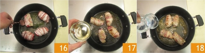 Dorad los rollitos a fuego medio durante unos 5 minutos, girándolos para dorarlos bien 16. Rociad con el vino blanco 17 y dejad que el alcohol se evapore. Cuando el alcohol se haya evaporado, añadid el agua 18.
