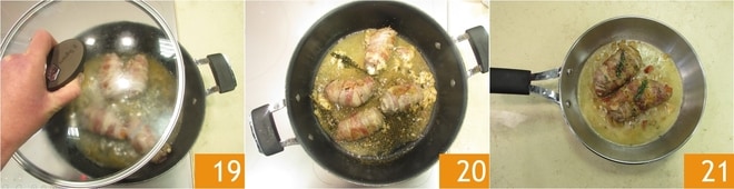 Tapad con una tapa 19 y continuad cocinando durante unos 5 minutos, luego destapad, subid el fuego y dejad reducir los líquidos en exceso 20. Los rollitos deben estar suaves y bien dorados. Apagad el fuego y servid vuestros rollitos de carne y panceta bien calientes 21!