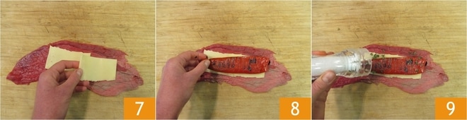 Tomad una loncha de scottona y extendiéndola sobre la tabla de cortar. Rellenad colocando una loncha de edam dividida por la mitad en el centro de la loncha de carne 7. Colocad sobre el queso también una loncha de pimiento cocido 8, añadid algunas hojas de tomillo fresco, sal 9 y pimienta.