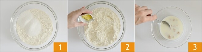 Para preparar los lemon rolls, primero derrite la mantequilla y déjala enfriar un poco. Tamiza la harina en un bol, luego agrega el azúcar 1 y la ralladura de limón 2. En un bol pequeño aparte, disuelve la levadura en un poco de leche tomada de la cantidad total 3.