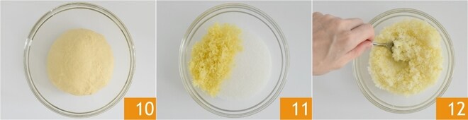 Debes obtener una masa elástica y homogénea 10. En este punto, vuelve a poner la masa en el bol, cúbrela con film y deja que suba a temperatura ambiente durante unas 2 horas o hasta que duplique su volumen. Mientras tanto, prepara el relleno mezclando en un bol el azúcar con la ralladura de limón 11 12. Derrite la mantequilla y déjala enfriar un poco.