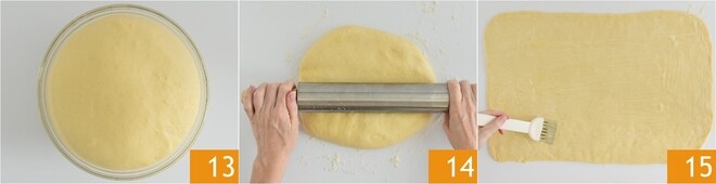 Pasado el tiempo de fermentación 13, extiende la masa sobre la superficie de trabajo ligeramente enharinada 14 hasta formar un rectángulo de aproximadamente 48x35 cm y pincélalo con la mantequilla derretida 15.