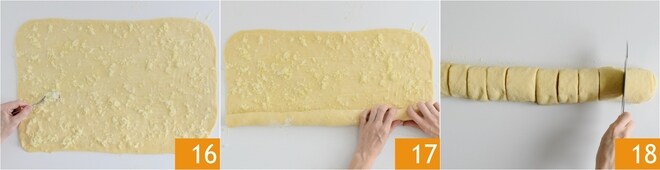 Distribuye la mezcla de azúcar y limón uniformemente sobre toda la superficie 16, luego enrolla suavemente el rectángulo por el lado más largo 17. Divide el rollo obtenido en 12 piezas de aproximadamente 4 cm cada una 18.