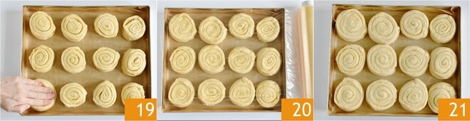 Forra con papel de horno un molde de 30x20 cm y coloca los rollitos dentro, separándolos aproximadamente 2 cm entre ellos, luego aplástalos ligeramente con la palma de la mano 19. Cubre el molde con film y deja que suba a temperatura ambiente durante unos 30 minutos 20. Pasado este tiempo, hornea los lemon rolls en el horno estático precalentado a 180° durante unos 30 minutos 21, colocando el molde en el estante medio.