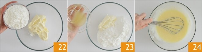 Mientras tanto, prepara el glaseado para la cobertura vertiendo en un bol el queso cremoso junto con el azúcar glas 22, la ralladura y el jugo de limón 23. Mezcla hasta obtener una mezcla homogénea 24, luego deja reposar en el frigorífico durante 30 minutos.