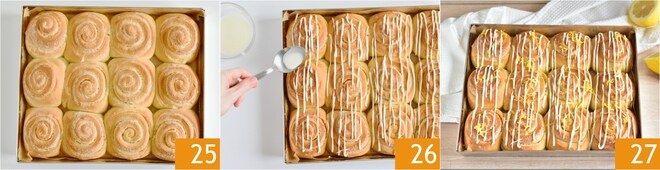 Cuando los lemon rolls estén dorados en la superficie, sácalos del horno y déjalos enfriar completamente 25, después puedes decorarlos con el glaseado 26. Espolvorea la superficie con más ralladura a tu gusto y tus lemon rolls están listos para disfrutar 27!