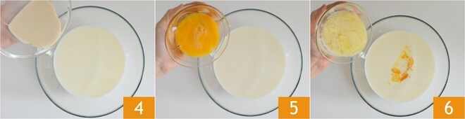 Vierte la mezcla de leche y levadura en la leche restante 4, luego añade el huevo batido 5 y la mantequilla derretida tibia 6.