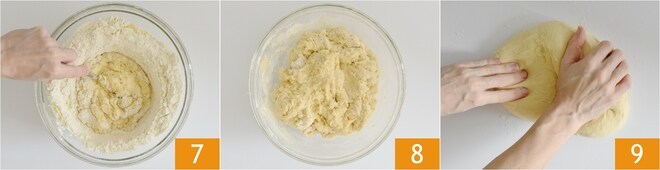 Añade los líquidos a los ingredientes secos y comienza a mezclar con una cuchara 7. Cuando los ingredientes estén bien integrados 8, transfiera la mezcla a la superficie de trabajo y amasa durante unos 10 minutos 9.