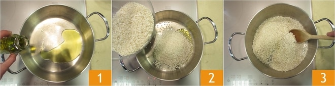 Para preparar la rosquilla de arroz rellena de berenjenas, como primer paso comenzad a hacer el risotto. Verted un poco de aceite en una cazuela 1, agregad el arroz 2 y tostádlo durante unos minutos 3.