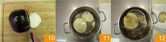 Mientras tanto, lavad la berenjena, cortad el extremo y cortadla en rodajas de unos 5 mm con una mandolina 10. Verted el aceite vegetal en una sartén y calentadlo hasta que alcance una temperatura de 170°. Luego sumergid unas pocas rodajas de berenjena 11 y cocinadlas durante unos minutos hasta que estén bien doradas. Luego escurridlas, pasadlas a un papel absorbente 12 y continuad con la cocción de las demás.
