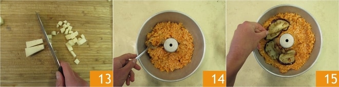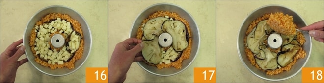 los cubitos de caciocavallo 16 y las otras berenjenas fritas encima 17. Cubrid todo con el arroz restante 18.