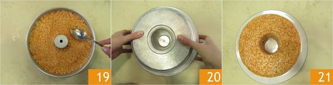 Compactad bien con el dorso de la cuchara 19. Coced en horno estático precalentado a 200° durante unos 25 minutos, luego sacad la rosquilla del horno y dejadla reposar durante unos 15 minutos antes de volcarla en un plato de servir 20 21.