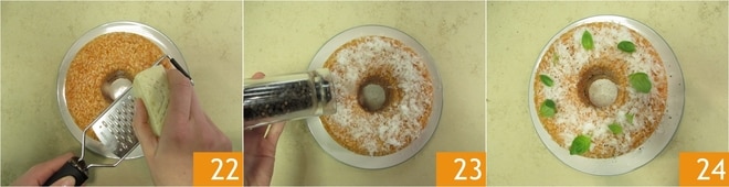 Adornad la rosquilla de arroz rellena de berenjenas rallando 30 g de caciocavallo en la superficie 22, una pizca de pimienta y las hojas de albahaca fresca 24.