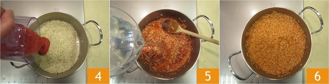 A continuación, añadid el puré de tomate 4, sal, pimienta y los primeros 300 gramos de agua 5. Cubrid con una tapa y coced durante 25/30 minutos, removiendo de vez en cuando y añadiendo más agua si es necesario. Al final de la cocción, apagad el fuego 6.