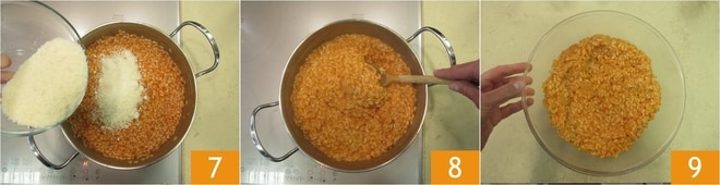 Sazonad el arroz con el Grana rallado 7, mezclad 8, luego verted el arroz en un bol y dejad enfriar a temperatura ambiente durante 1 hora 9.