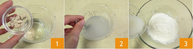 Para preparar la rosca de pizza alta y esponjosa hemos elegido amasar todo a mano, pero si preferís utilizar la amasadora, podréis seguir los mismos procedimientos, usando el gancho a velocidad media baja. Comenzad desmenuzando la levadura en el agua a temperatura ambiente 1 y disolvedla bien 2, la temperatura ideal del agua es de 25°. Alternativamente, podéis también desmenuzar la levadura en la harina, el resultado no cambiará. Si preferís, podéis usar 2 g de levadura de cerveza deshidratada. Continuad vertiendo la harina Manitoba y la harina 00 en un recipiente. Luego verted el agua poco a poco 3 mientras amasáis con las manos.