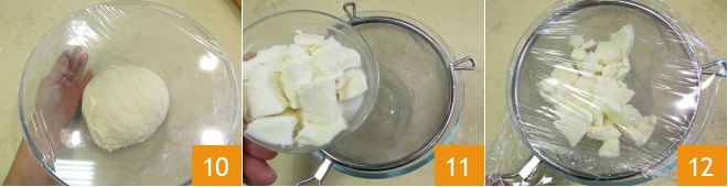 Transferid la masa así formada en un bol, cubrid con film transparente 10 y dejadla fermentar. Para mayor comodidad, podéis poner el bol en el horno apagado pero con la luz encendida, así el interior alcanzará la temperatura de 26-28°, ideal para la fermentación; alternativamente, también podéis mantener el bol en un lugar cálido. Los tiempos son aproximados ya que cada masa, la temperatura y las condiciones meteorológicas influyen en la fermentación: en promedio, la masa debería tardar 2 horas y 30 minutos en duplicar su volumen. Mientras la masa fermenta, cortad la mozzarella fior di latte en 15 piezas, de unos 8 g cada una. Dejad escurrir la mozzarella en un colador cubierto con film en la nevera 11 12.