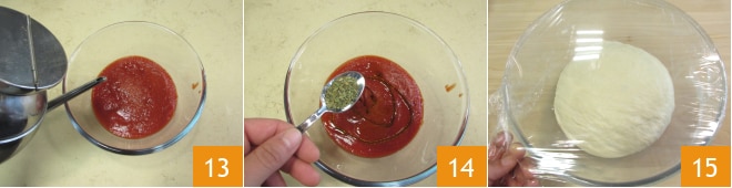 Transcurrido el tiempo de fermentación, condimentad el puré de tomate con aceite 13, sal y orégano 14. Luego, retomad la masa fermentada 15.