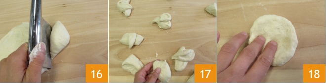 Cortad la masa con una rasqueta 16 en 15 piezas de unos 50 g cada una 17. Ayudaos con harina y estirad con los dedos la masa 18.