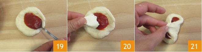 En el centro poned una cucharadita de puré de tomate 19, un trozo de mozzarella 20 y cerrad la bolita llevando los bordes hacia el centro 21.