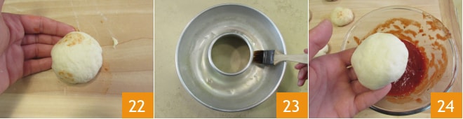 Así habréis formado un bocadito relleno 22. Tomad un molde para rosca de 27,5 cm de diámetro y pincelad el fondo y el borde con el aceite 23. Sumergid la bolita en el bol del puré de tomate 24.