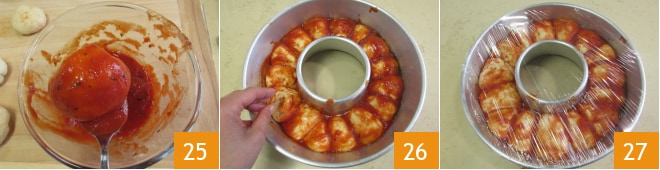 Aseguraos de que la bolita esté cubierta con la salsa 25, luego colocadla dentro del molde. Colocad las bolitas cerca una de la otra 26. Cubrid con film y dejad fermentar durante unos 60 minutos 27.