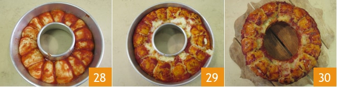 Transcurrido el tiempo de fermentación 28, hornead en horno ya caliente a 190 grados durante unos 35 minutos. Una vez cocida, dejad enfriar durante unos minutos 29 y luego desmoldad vuestra rosca de pizza alta y esponjosa 30.