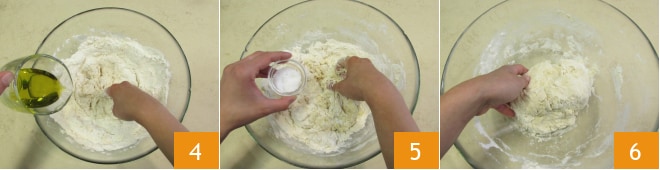 Verted luego el aceite 4, poco a poco. Cuando hayáis vertido la mitad del líquido, podéis añadir también la sal 5 y amasad 6 hasta que la masa esté lisa y homogénea.