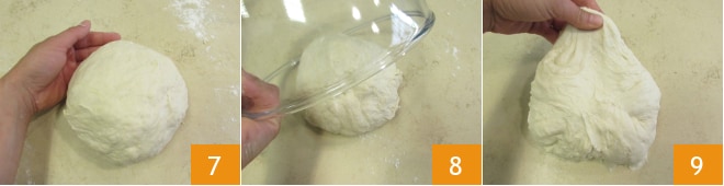 Obtenida una bola lisa 7, dejadla reposar en la superficie de trabajo durante unos diez minutos cubriéndola con el bol 8. Una vez reposada, hacedle un pequeño pliegue: imaginad que la esfera está dividida en 4 partes, tomad el extremo de cada una, tiradlo suavemente y plegadlo hacia el centro 9, finalmente dadle la forma de una esfera.