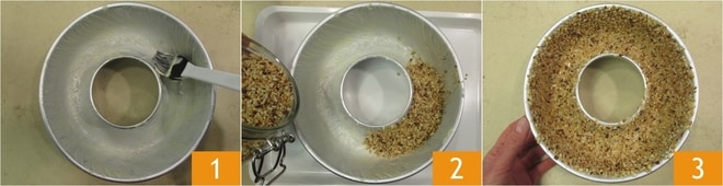 Para realizar el rosco de avellanas, primero untad con mantequilla un molde de rosca de 20 cm de diámetro 1, luego verted el granillo de avellanas 2 de forma que cubra tanto la base como los lados 3.