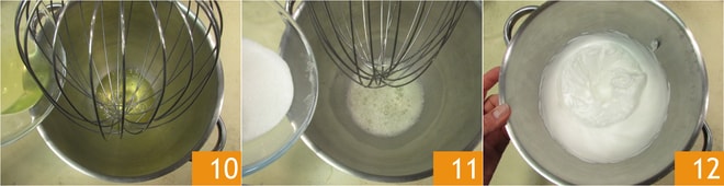 Reservad la mezcla de yemas y verted las claras en el bol de una batidora con varillas 10. Empezad a montar, luego añadid 120 g de azúcar manteniendo siempre las varillas en acción 11. Debéis obtener una consistencia bastante cremosa 12.