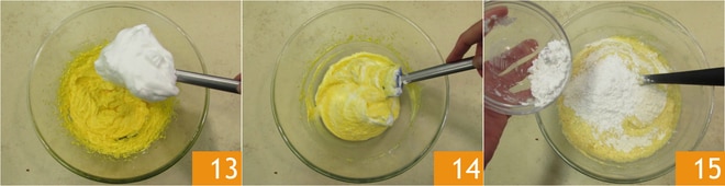 Incorporad las claras montadas a la mezcla de yemas 13, mezclando delicadamente con una espátula 14. Empezad añadiendo primero un tercio de las claras montadas y luego el resto. Añadid la harina 00 y la fécula 15 y mezclad nuevamente.