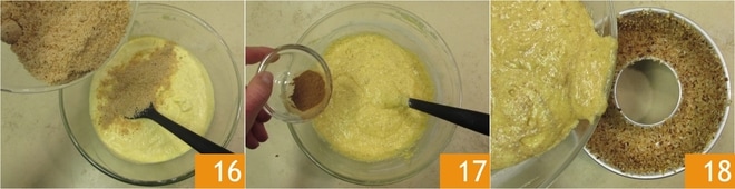 Finalmente, integrad también la harina de avellanas 16 y la canela 17. Verted la masa obtenida en el molde de rosca untado y cubierto de avellanas 18, luego golpeadlo suavemente sobre la mesa de trabajo.