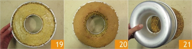 Hornead en horno estático precalentado a 170° durante unos 40 minutos 19. Comprobad la cocción con un palillo, luego sacad del horno y dejad enfriar completamente en el molde 20 antes de volcar el rosco sobre un plato de servir 21.
