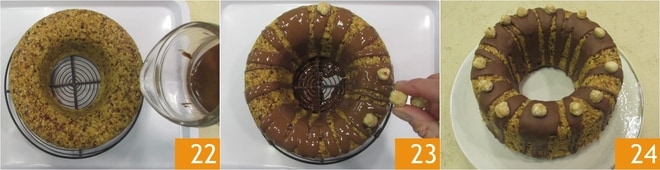 Decorad el rosco con chocolate gianduja fundido 22 y completad con avellanas enteras tostadas 23. ¡Vuestro rosco de avellanas está listo para ser disfrutado 24!