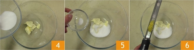 Dejad aparte el molde y preparad la masa: en primer lugar, separad las claras de las yemas. Poned la mantequilla ablandada y 55 g de azúcar en un bol 4, añadid la sal 5 y la ralladura de limón 6. Batid con varillas eléctricas para mezclar los ingredientes hasta obtener una crema.