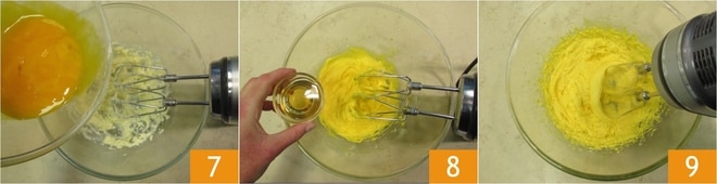 En este punto añadid las yemas 7 y el brandy 8, continuando a mezclar con las varillas hasta obtener una mezcla lisa y homogénea 9.