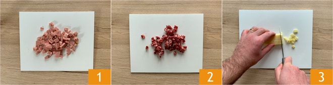 Para preparar el roscón salado fácil, como primer paso, corta en cubos grandes de 1 cm la mortadela 1, el salami de Nápoles 2 y el provolone 3.