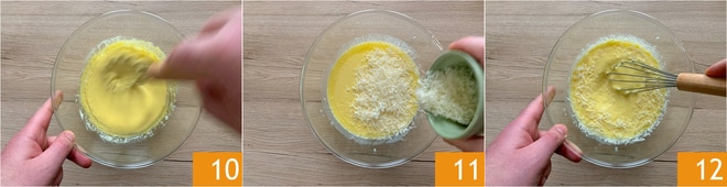Mezcla nuevamente con el batidor 10 y añade el Grana Padano 11. Incorpóralo al resto mezclando 12.