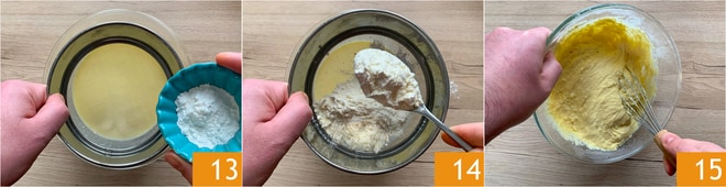 Tamiza directamente en la mezcla la levadura 13 y la harina 14. Bate con el batidor hasta obtener una masa densa y suave 15.