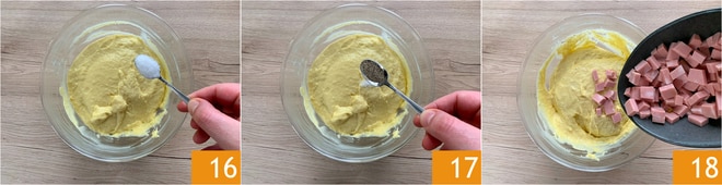 Añade la sal 16 y la pimienta 17. Vierte dentro los cubos de mortadela 18,