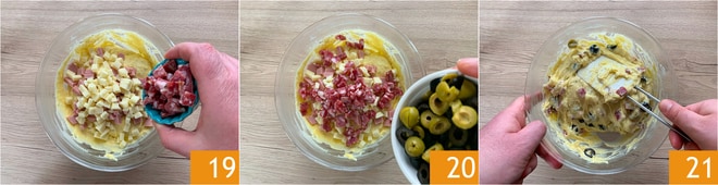 el queso, el salami 19 y las aceitunas 20. Ahora mezcla todo con una espátula 21.