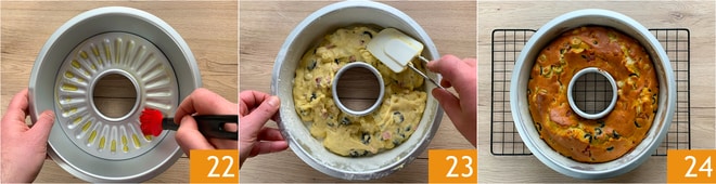 Toma un molde de 24 cm en forma de rosca, úntalo con aceite 22 y cúbrelo con harina. Transfiere la masa dentro, nivela con la espátula 23 y cocina en horno estático precalentado a 180° en la rejilla central durante 30-35 minutos. Antes de sacar tu roscón salado del horno, verifica la cocción con un palillo. Cuando esté cocido, saca el roscón 24 y deja enfriar un poco antes de desmoldar y servir.