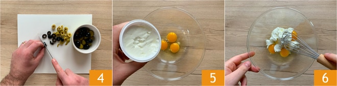 Luego corta en rodajas tanto las aceitunas negras como las verdes 4 y reserva. Pasa entonces a la masa del roscón. Vierte en un bol los huevos y el yogur 5, mezcla con un batidor 6,