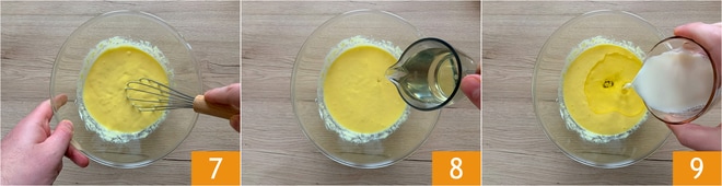 hasta obtener una mezcla suave y sin grumos 7. Añade el aceite 8 y la leche 9.