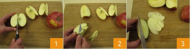 Para preparar las rositas de hojaldre y manzanas, comienza poniendo en el fuego un cazo lleno de agua, luego pasa a limpiar las manzanas: córtalas en gajos 1, quítales el corazón con un cuchillo 2 o con la herramienta adecuada. Luego corta las manzanas en rodajas muy finas 3.