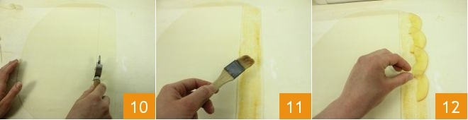 Utilizando un cortador de pasta liso, corta de cada hoja 6 tiras de pasta de aproximadamente 5 cm de ancho 10. Unta cada tira con mermelada de albaricoque 11, seca las rodajas de manzana con papel absorbente y colócalas a lo largo de cada tira, ligeramente superpuestas: la parte con la cáscara debe sobresalir de uno de los lados de la tira de hojaldre 12.
