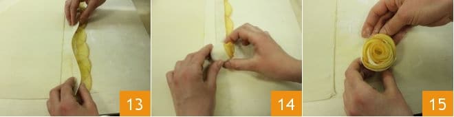Ahora dobla la tira restante de hojaldre sobre las manzanas 13 y enróllala sobre sí misma comenzando por uno de los dos extremos más estrechos 14; asegúrate de que la última parte quede bien fijada y así tendrás formada una rosita 15.