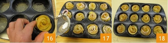 Coloca cada rosita dentro de uno de los agujeros del molde 16 y cuando las hayas terminado, espolvoréalas con azúcar glass 17. Hornea en horno estático precalentado a 170°C durante 45 minutos. Una vez cocidas, saca las rositas de hojaldre y manzanas del horno 18 y antes de que se enfríen, desmóldalas, de lo contrario, al enfriarse, el azúcar tenderá a solidificarse y podría resultar difícil despegarlas.