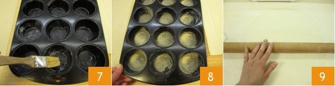 Ahora, unta con mantequilla un molde para muffins utilizando un pincel y mantequilla blanda 7, luego espolvorea cada sección con azúcar moreno 8. Toma el hojaldre y estíralo para obtener dos rectángulos 9.